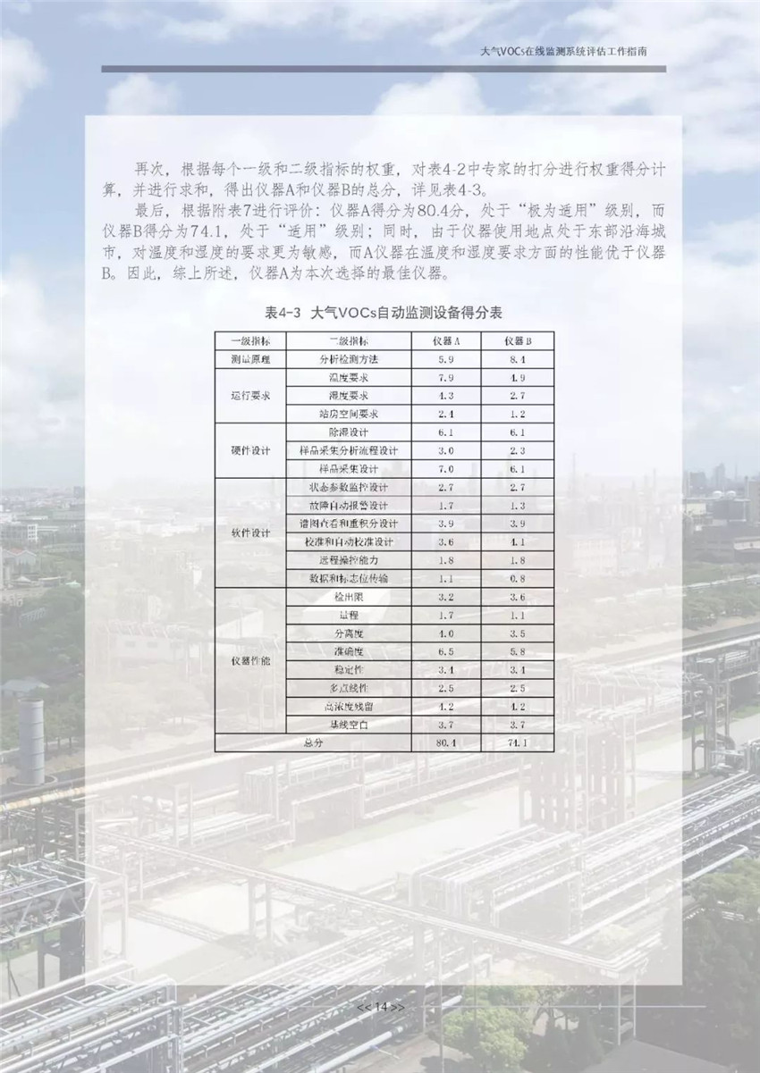 其次,邀請至少5名同行專家對“表4 2大氣VOCs自動監測設備選型專家打分表”中儀器A和儀器B進行每項指標的打分,并將每個專家的每項指標的打分進行加權平均計算后填入表4-2中。