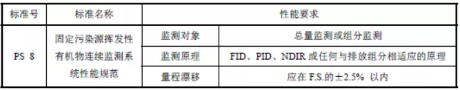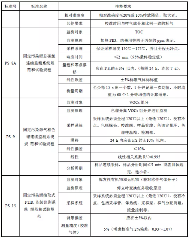 美國EPA 在40 CFR PART 60 中配套有固定源廢氣VOCs的監測方法,同時頒布了一系列儀器性能要求標準(Performance Specification, PS),其中PS 8 是污染源VOCs 在線監測儀器的總綱,PS 8A 是用氫火焰離子化檢測器(FID)原理監測總烴儀器的技術要求,PS 9針對氣相色譜法監測VOCs 的儀器,PS 15 針對傅立葉紅外法監測VOCs 的儀器。